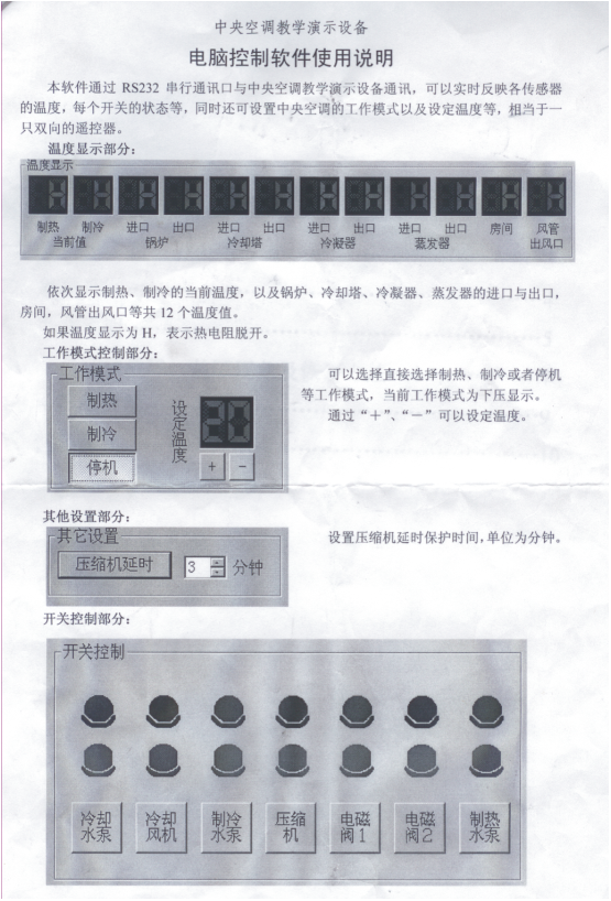為了更好地滿足各大院校的教學需要,在原來開發(fā)的中央空調(diào)實驗設備的基礎上,配備了RS-232串行通訊接口,可直接與電腦連接,由電腦控制軟件控制整個實驗臺的運行,包括:總控臺啟動、制冷、制熱、冷卻水泵、冷卻風機、制冷水泵、壓縮機、電磁閥、制熱水泵做演示,制冷、制熱的溫度設定等。