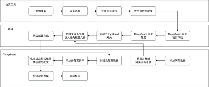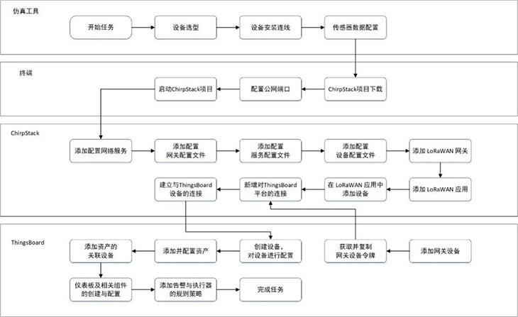 模擬智慧牧場系統(tǒng)還引入使用開源軟件平臺ChirpStackThingsBoard,結(jié)合LPWAN技術(shù),實現(xiàn)遠程低功耗數(shù)據(jù)采集、上報和展示。在ChirpStack平臺上,用戶可對網(wǎng)關(guān)、GPS、溫濕度傳感器等設(shè)備進行配置,以上送仿真實驗中的虛擬數(shù)據(jù)。在ThingsBoard平臺上,設(shè)置牧場地圖、告警信息、溫濕度等各儀表盤組件;獲取仿真設(shè)備上送的數(shù)據(jù),并將數(shù)據(jù)以圖表形式作可視化呈現(xiàn);以及基于流式編程添加相應(yīng)的規(guī)則策略,最終完成模擬智慧牧場實訓(xùn)場景的部署搭建。
